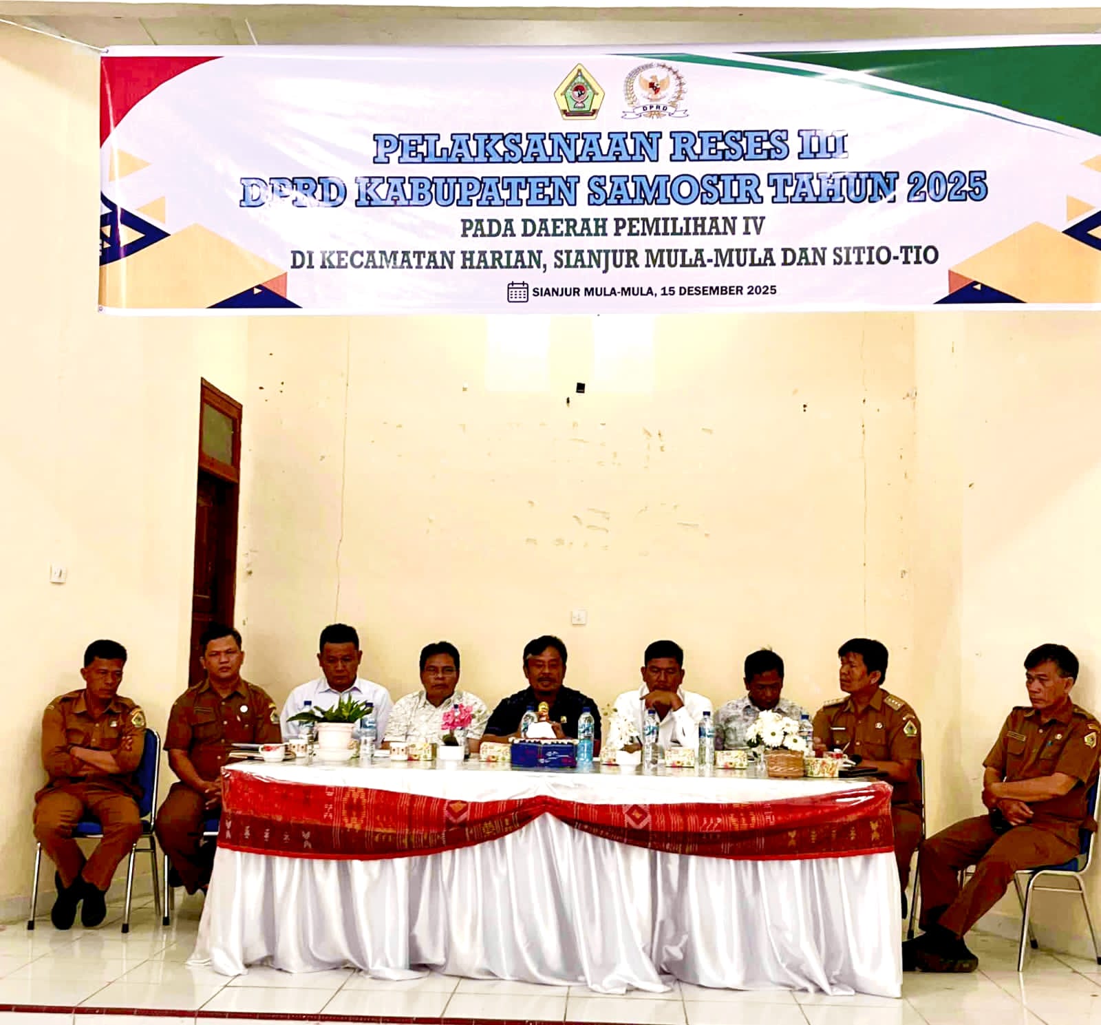 Hal ini disampaikan Basaruddin Situmorang saat reses III DPRD Samosir Daerah Pemilihan IV (Kecamatan Harian, Sianjur Mula-mula, Sitiotio), yang dihadiri Wakil Ketua DPRD Samosir, Sarhochel Tamba (NasDem), anggota dewan Pantas Limbong (PKB), Jonny Sagala (Golkar), Hannes Sihotang (PDIP), serta dihadiri para pelaku UMKM, Camat Sianjur Mula-mula, Harian, Sitiotio, dan Sekretaris Dinas Kopnakerindag Samosir, Senin, 15 Desember 2025 di Kantor Camat Sianjur Mula-mula.